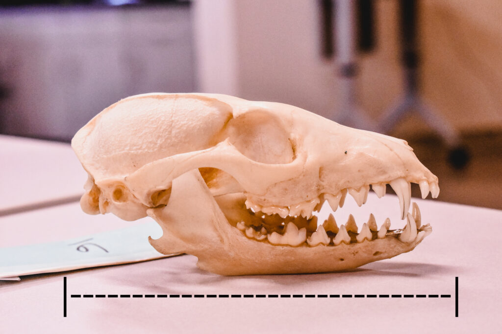 Just about all types of animals, predominantly vertebrates, have some sort of skull, which is a hard, structure made of bone that forms the head. All mammals have skulls, but the structure of each differs according to what species of mammal it is. To distinguish between each type of mammal skull, there are different factors to investigate. First, you need to look at the size of the skull, which can be done by using a measuring tape and recording the length, in centimeters, from end to end. Once you figure out the length of the skull, you will be able to calculate the body size of the animal by multiplying the skull length times 5. The product, or result, is an estimate of the animal’s length from the snout to base of the tail, where the tail begins.