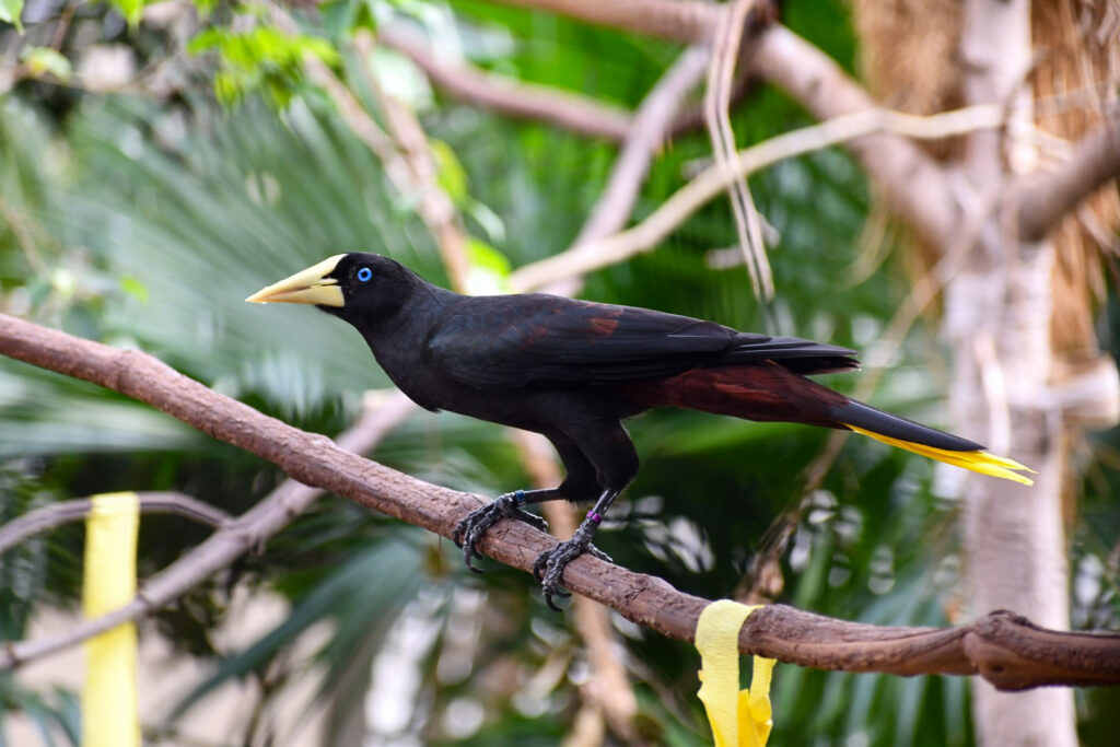 Facts: Crested oropendolas live in small flocks of 15-30 females and 3-4 males. The dominant male in the group mates with several females each breeding season.