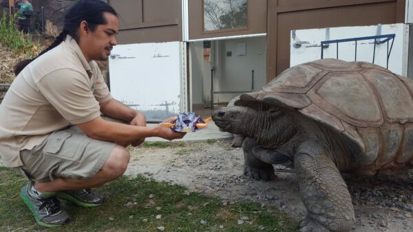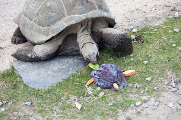Chef Yohn prepared a turtley-awesome meal that looked surprisingly like its shelled counterparts. Once the tortoises saw the yummy treats, they came running as fast as they could, which took a few minutes since we all know tortoises are slower than most animals. On the menu for this month’s Animeals is a healthy meal made of cabbage, sweet potato, pear and tortoise chow, strategically placed together to form what our Zoo Chef likes to call “Purple Tortules”!