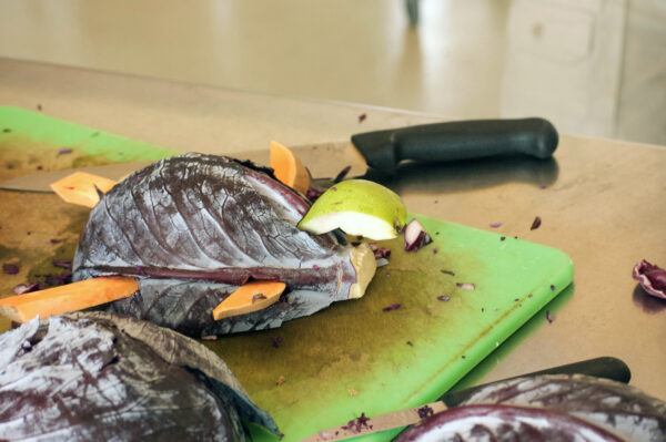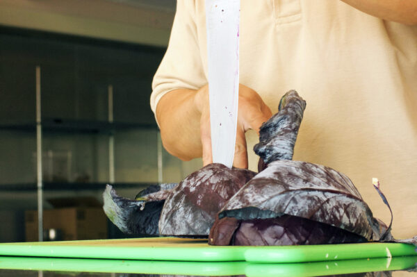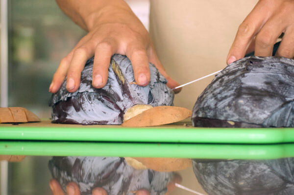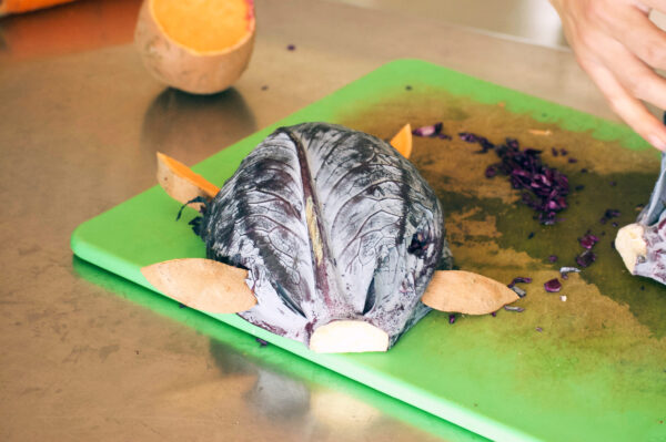 Step 1: Cut the cabbages in half. This will be the “turtle shell.”
