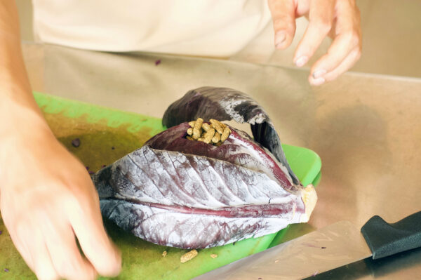 Step 3: Fill the hole with tortoise chow and fold back the layer of cabbage to cover the pellets.