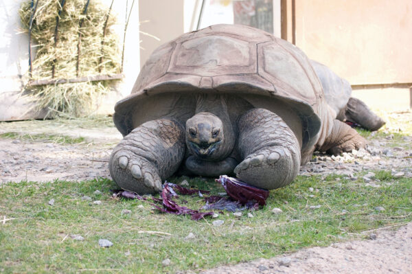 The warm weather means more of our animals come out of their temperature controlled shelters to bask in the sun or take dips in their pools. The same goes for our five Aldabra tortoises – AJ, Bubbles, Dotty, Jackson and Lynn St. James, who trekked outside to enjoy the sunshine and a special feast.