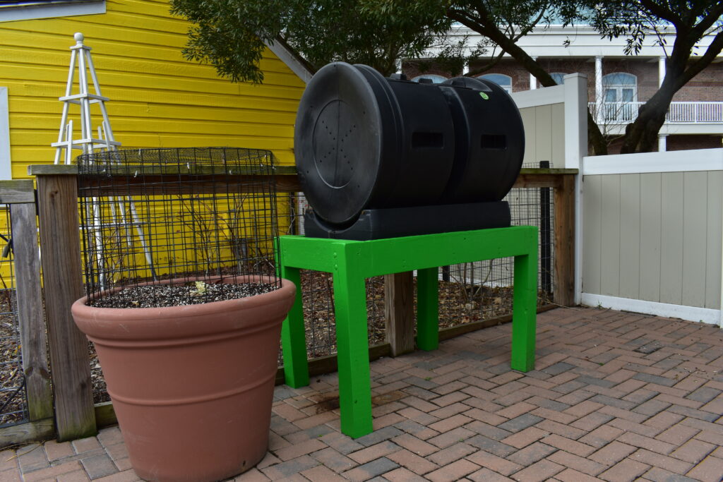 Since the Virginia Zoo lacks what the NC Zoo has – a spare acre or two of land, the horticulture team had to get creative with space in order to begin composting on Zoo grounds. So the idea of composting in barrels was introduced. The Zoo purchased two composting barrels using grant funds and also constructed bases for the two barrels. The barrels have 80 and 52 gallon capacities and are designed for the compost inside to be easily rotated, which is essential for the organic material to decompose evenly.