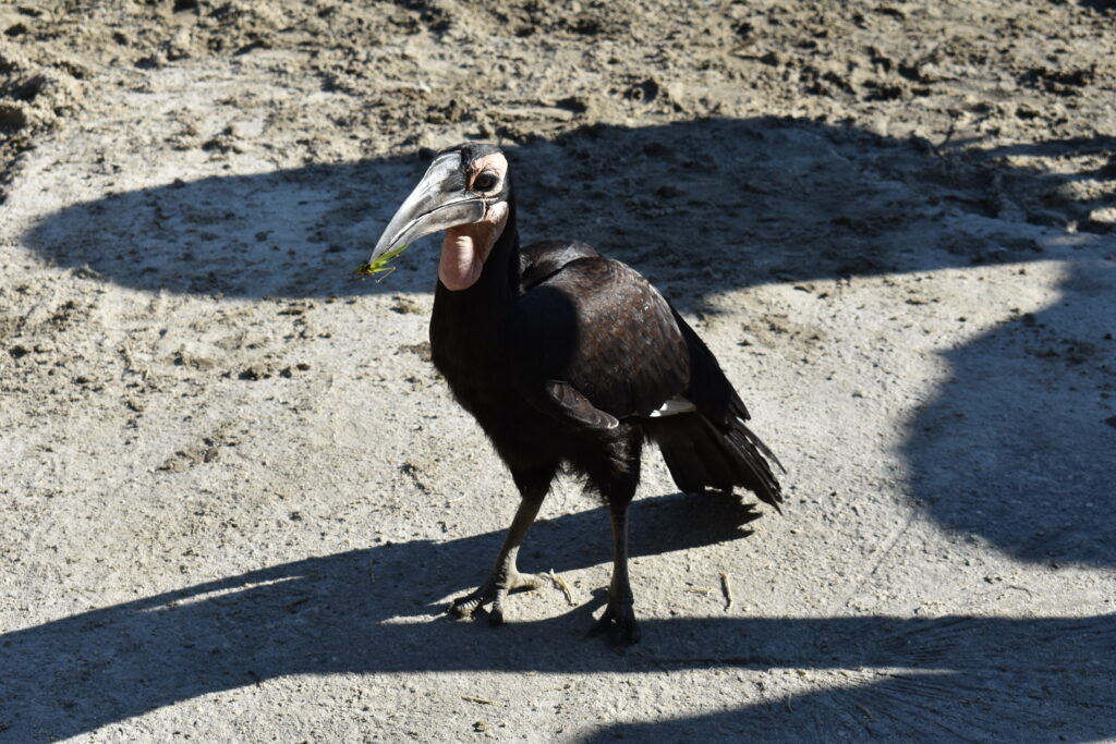 Before introducing you to the members of the group, it’s important to know details about the species. Ground hornbills are the largest and heaviest of the hornbill species and are separated into two subspecies, the Abyssinian ground hornbill and Southern ground hornbill, which can be found at the Virginia Zoo. Southern ground hornbills (Bucorvus leadbeateri) are all almost entirely black with white wing feathers that can be seen when they take flight, although they only fly low to the ground for short periods of time. Both mature males and females also have a bright red throat sac, but females also have blue patches under their chins. These sacs, also known as gular sacs, are used for amplifying their unique calls.