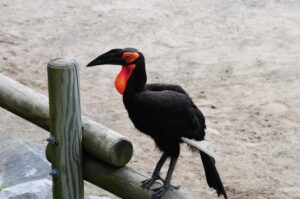 Several of the Virginia Zoo’s Africa Okavango exhibits are unique in that animals representing multiple species often live with each other, just as they could be found in the wild. The giraffe yard is no exception, with four different species of animals cohabitating together. The tower of Masai giraffes live with a small and elusive herd of Yellow-backed duikers, a dynamic duo of ostriches and an eclectic group of Southern ground hornbills. While the mammals in this exhibit are equally as interesting, this month’s Tales of the Tails blog features the Zoo’s three Southern ground hornbills.