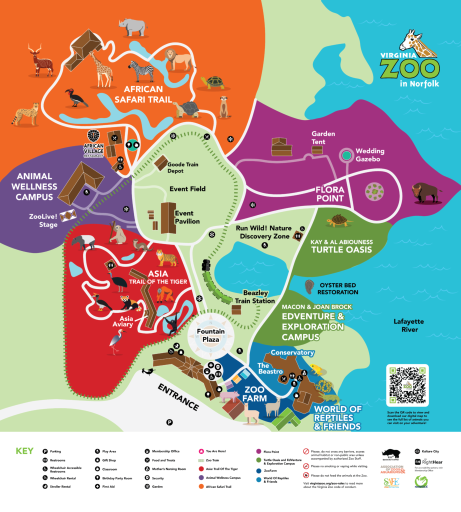 The Virginia Zoo is located at 3500 Granby Street, Norfolk, VA 23504, just two miles from Downtown Norfolk, a short 25-minute drive from the Virginia Beach Oceanfront and easily accessed from Interstate 64.