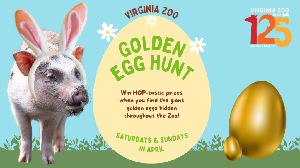 Every Saturday and Sunday throughout April, there will be 10 large golden eggs hidden throughout the Zoo. All eggs will have a Virginia Zoo prize pack but 2 eggs each day will have larger prizes. NEW! This year we’ll have prizes from partner organizations included in the large eggs. We will also be hiding 30 small golden eggs each day with a Virginia Zoo trading card prize!