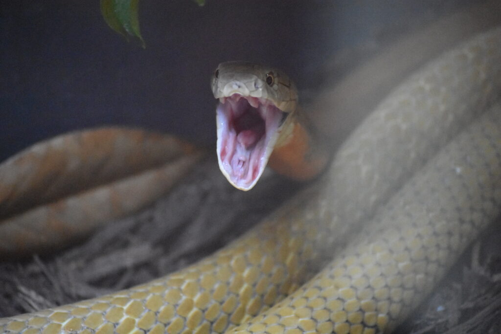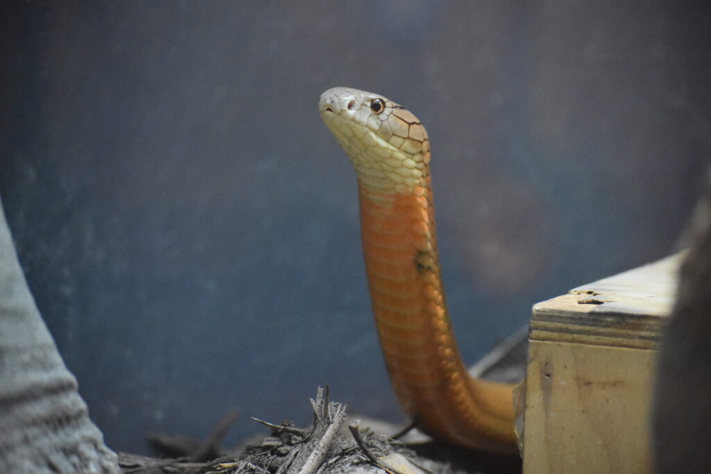 Keepers almost never handle Clarice, but have a unique method of feeding her and cleaning her exhibit. On the very right of her exhibit is a hole leading to a smaller shift area. Keepers open the door to this area and Clarice will slither into the enclosed box and curl up on a heating pad – remember, snakes use heat to regulate their body temperatures, so Clarice thoroughly enjoys her heating pad! Keepers say Clarice will also often “let you know she is a king cobra and that she demands your respect” if you look at her through the plexiglass in her shift box.