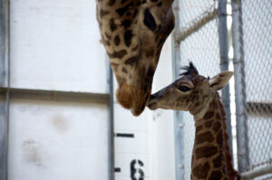 Zoo Keepers say the calf has been developing very well. She is still drinking her mother’s milk, but has been munching on browse already. She is very curious and appears to enjoy exploring her new surroundings. Zoo staff and guests alike are in awe of how cute she is, and her crooked ossicone only adds to her cuteness.