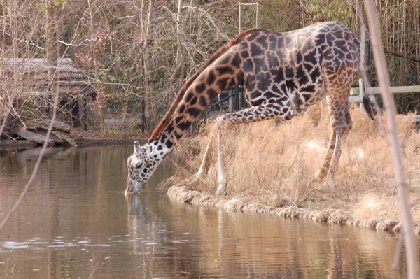 Imara, the calf’s mother, has been at the Virginia Zoo for much longer than her offspring; since 2003 to be exact. Imara was born at the Roger Williams Park Zoo in Providence, Rhode Island on April 4, 2002. This 15 year old giraffe still has a lot of years left in her life, as giraffes under human care can live to be up to 30 years old. She’ll eat just about anything, but is especially fond of Hackberry, Mulberry, Magnolia and Bamboo. At 16 feet tall, Imara’s daily diet consists of her favorite foods as well as 13 pounds of grain, alfalfa and browse; produce such as carrots and sweet potatoes are usually given to her during training sessions or behind-the-scenes giraffe tours. Imara usually spends her time browsing around her exhibit, probably because she seems to want to be aware of her surroundings at all times, especially with a newborn. Imara can also be seen dropping her chewed cud on the ground frequently.