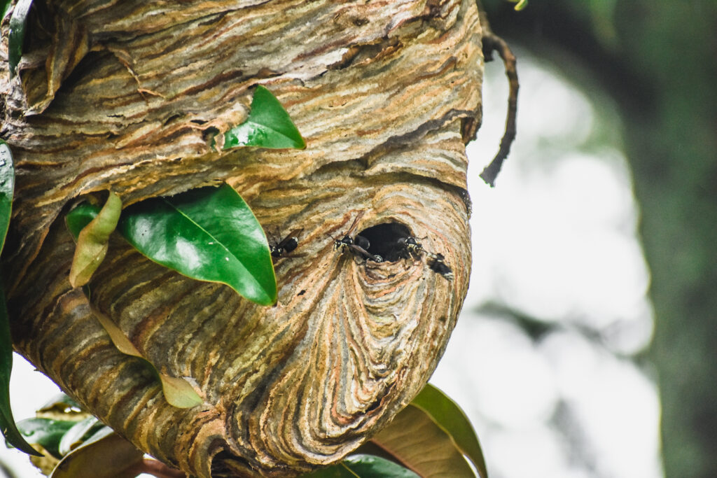 Bees are notorious for making their nests using beeswax, and wasps and hornets create their paper carton nests in a similar fashion – by using their spit. The hornets collect wood fibers by ingesting them from trees and even man-made wooden structures such as fences and houses. They then mix their saliva with the wood particles and make a paste to create both the egg combs on the inside of the nest as well as the outer shell.