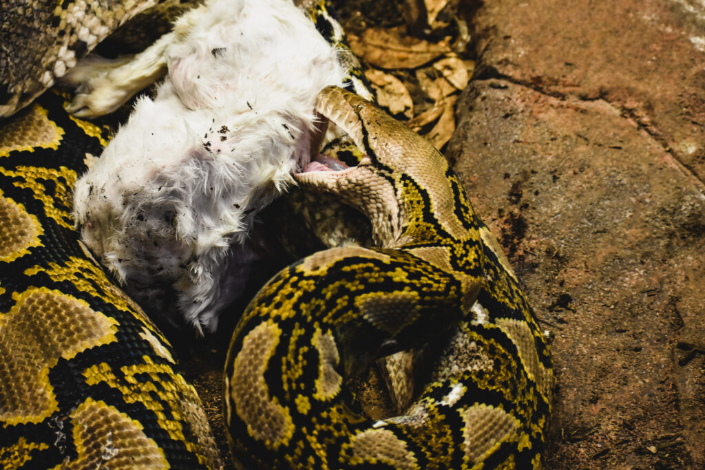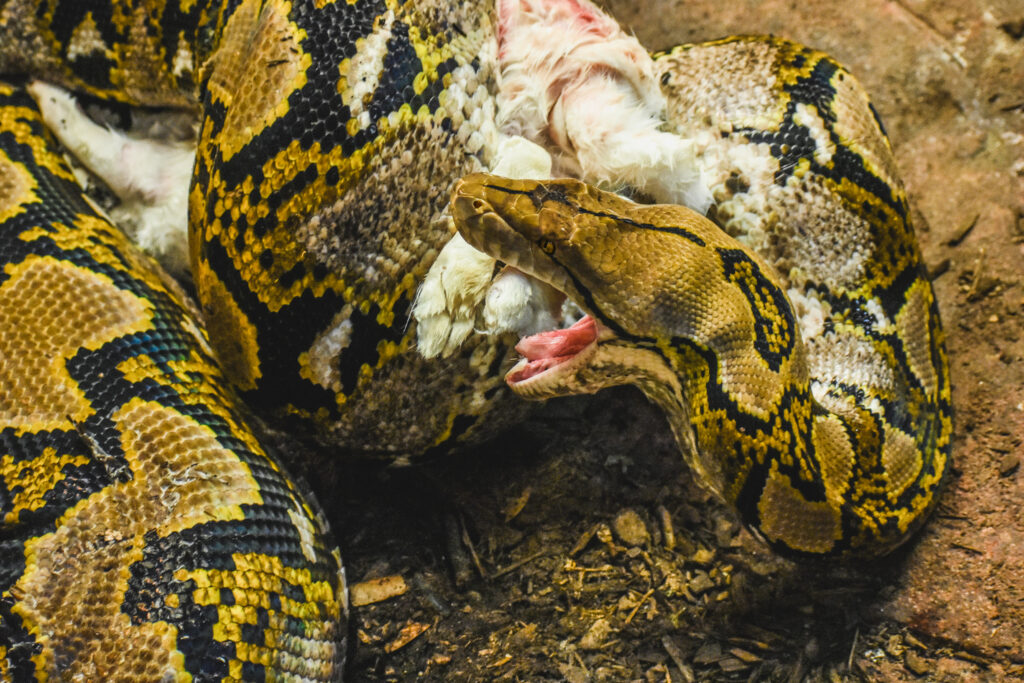 Snakes don’t eat often and can go weeks or even months without a meal, depending on the size and species. Some smaller snakes prey on birds, eggs and small mammals, but the larger the snake, the larger the prey. Reticulated pythons are the largest snake species in the world, so they need to eat a big meal to get enough sustenance, but can also go longer periods of time without eating because of how large a meal is.