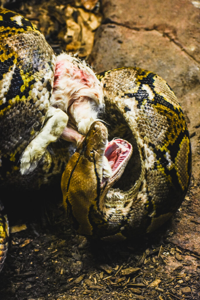 At the Virginia Zoo, the reticulated python feeding schedule has no set date or time. Keepers keep track of feedings and monitor the snakes’ movements, which has helped establish a feeding system. When the reticulated pythons aren’t active, they are probably still full from their last meal and won’t be eating anytime soon. Once Keepers notice higher levels of activity, they begin prepping for meal time.