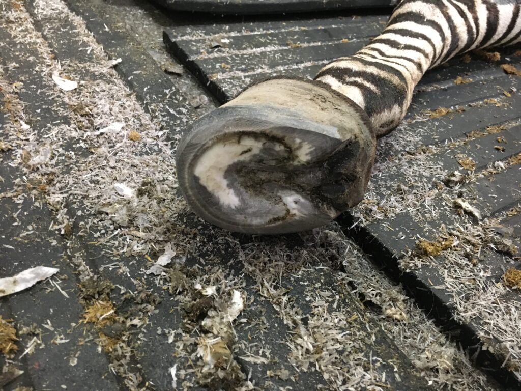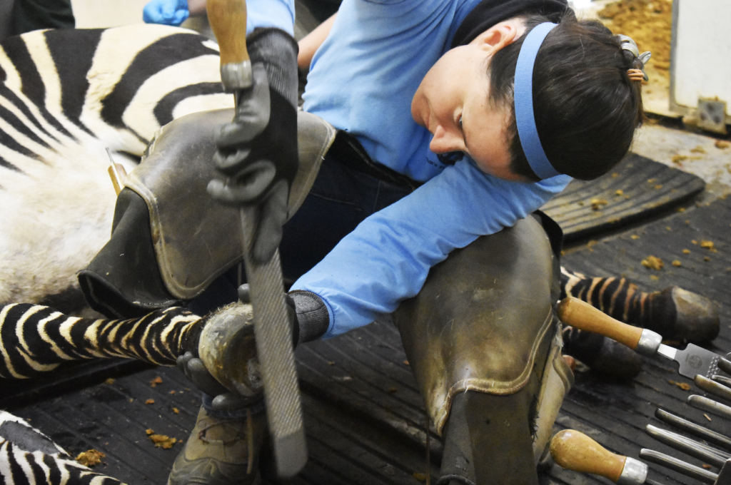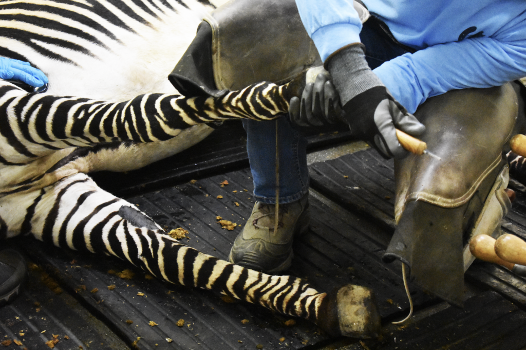 For these procedures, the Zoo’s Vet Team calls for assistance from Kim Burnop, a local farrier, or professional who specializes in the trimming of horse hooves. With her expertise, they can give our zebra’s hooves full care that includes cleaning, trimming, and filing. Hoofstock, like such as zebras, need this proper care to avoid the development of hoof overgrowth which can cause them to develop lameness or hoof infections. Since Ruuxa’s last exam in May, her hooves showed great improvement.