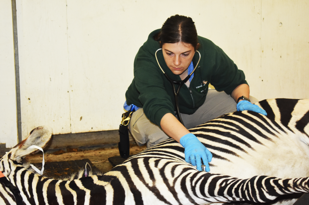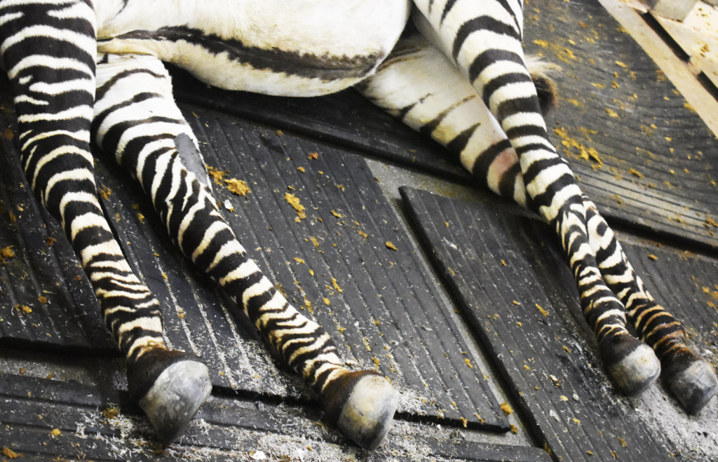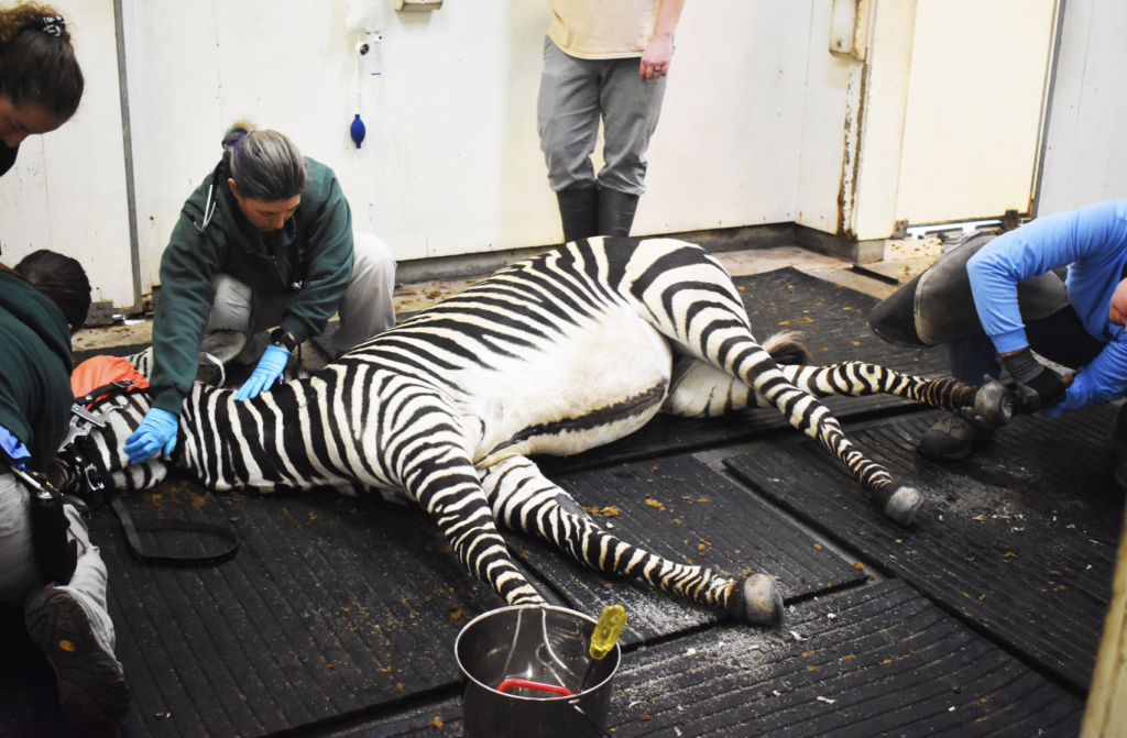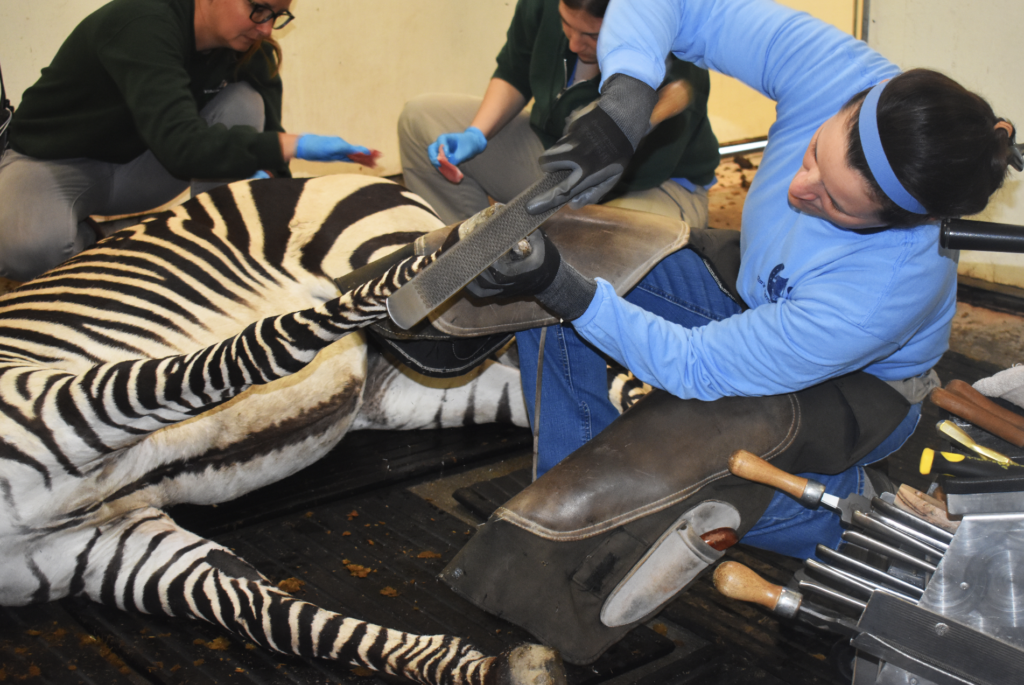 Ruuxa, the six-year-old Hartmann’s mountain zebra, underwent a procedure to receive her scheduled routine preventative health examination and hoof trim last week. Like domestic horses, zebras need routine hoof trims, as hoof walls continuously grow – as human nails do. Since zebra are wild animals, they require general anesthesia to safely perform the procedure.