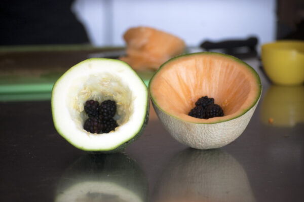 Step 2: Put most of the blackberries in the bottom of the zucchini and cantaloupe halves. Save 3-4 blackberries to use later as a garnish.