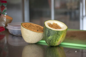 Step 1: Scoop out the insides of the zucchini and the cantaloupe, making them into bowls. Reserve the cantaloupe pieces.