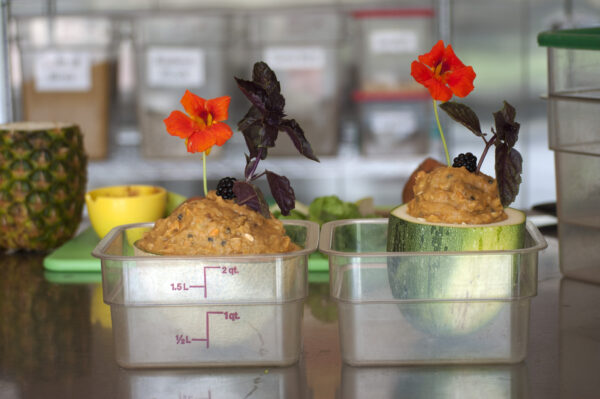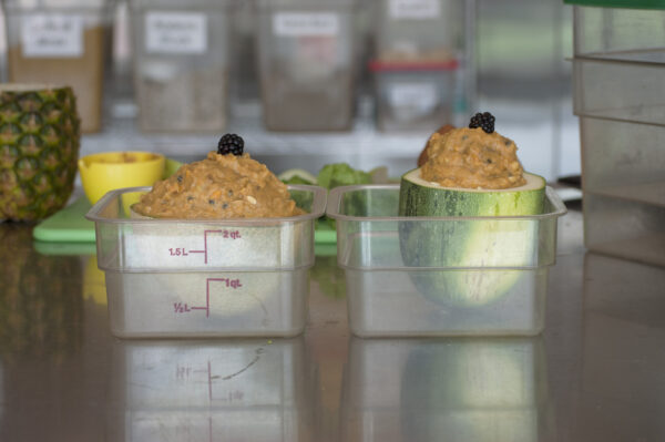 Step 4: Scoop mixture into the zucchini and cantaloupe bowls.