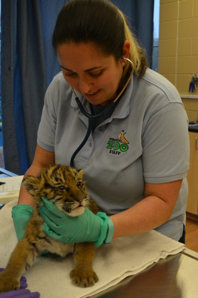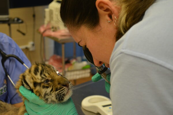 The critically endangered Malayan tiger cubs are one month old! Their eyes have opened and they are starting to crawl around. Like human babies, checkups and vaccinations are required for our tiger babies. Dr. Amanda Guthrie did a complete physical of the cubs today to look for any congenital or development abnormalities. Weight and temperature are taken, plus the heart and lungs are listened to for any irregularities. Both boys checked out great and are up to almost 9 pounds each! They are also starting to get their first teeth – middle incisors on the top.