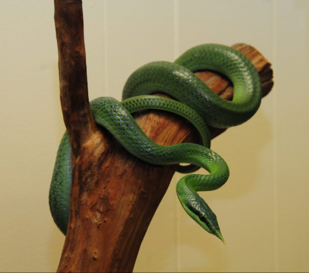 This unique looking snake has the best advantage in its native rainforest habitat. The snake’s green color blends in with its surroundings, otherwise known as camouflage. A Rhino rat snake will sit very still in lush greenery while waiting for prey to kill. The prey, which includes rats and other small rodents, has no idea there is a predator near, ultimately aiding in its demise.