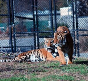 The Virginia Zoo has three Malayan tigers, father Christopher (left) and male cubs Stubbley and Osceola (right).