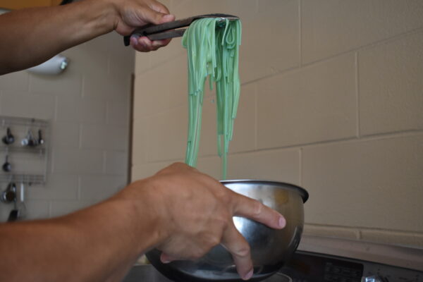 8. Drain pasta and separate evenly into two servings.