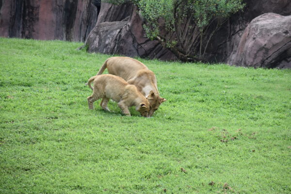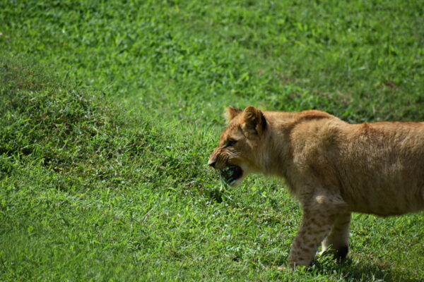 The lions at the Zoo receive a special “Nebraska Feline Diet”, which is ground meat equipped with all of the minerals and nutrients they need. Twice a week Keepers switch up the trio’s diets with their favorite foods: a rack of ribs for Zola and Emery to share, and a large rabbit for Mramba.