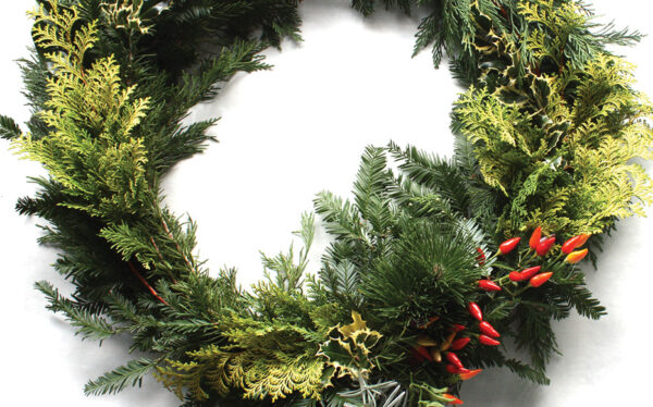 Want a handmade eco-friendly wreath for your front door? Use greens, herbs, dried fruits and vegetables and other accouterments from your garden or local grocer.