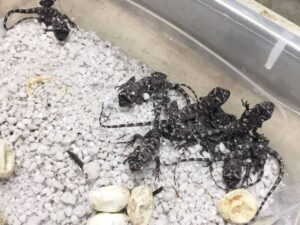 Some animals arrived late to the party, leaving Zoo visitors guessing at who’d join us next. Among the first to arrive shortly after opening, we welcomed our female king cobra, Clarice. A couple of weeks later, the building’s main attraction, two female Siamese crocodiles arrived from the St. Augustine Alligator Farm. Although Makara died suddenly earlier this year, Shadie can be found basking in pockets of sun and floating around the pool. Other reptilian and amphibian arrivals include Iranian newts and caecilians, Egyptian tortoises and the popular herd of Lined seahorses. We can’t forget about our warm-blooded friends as well as a creepy-crawly who also made their way onto exhibit.