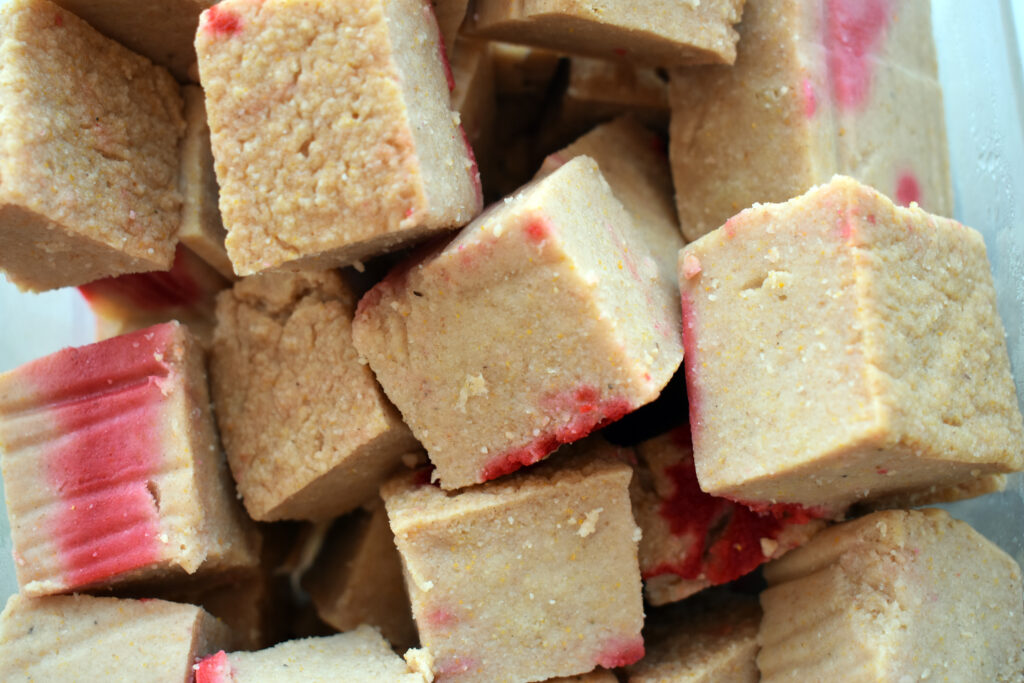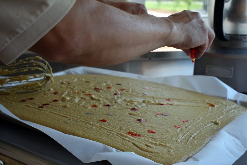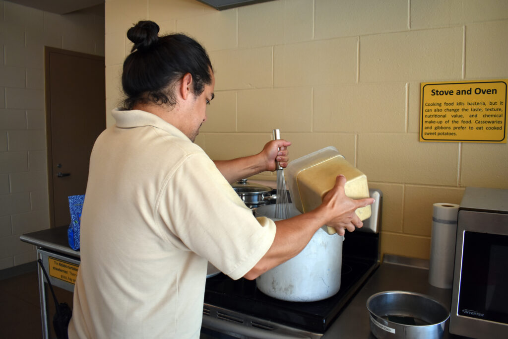 Once a week, Chef Yohn turns the powder into a gelatin-like food for Keepers to offer to the birds alongside a range of fruits, including Riobi and Oona’s favorite: grapes. The process for making the gel is quite simple, and just like your favorite flavor of Jell-o, the gel has to sit in the fridge overnight to set. While the rhino hornbills’ gel doesn’t normally come in such vibrant colors as humans’ favorite wiggly treat, Chef Yohn gives his recipe some color or texture on occasion as extra enrichment.